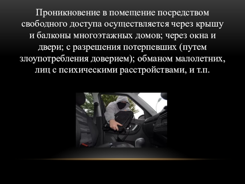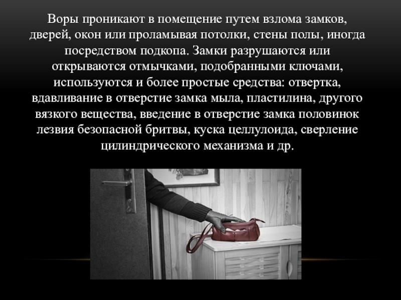кражи с преодолением (путем взлома, подбора отпирающих устройств и т.п.) запирающих устройств, преград и хранилищ;
