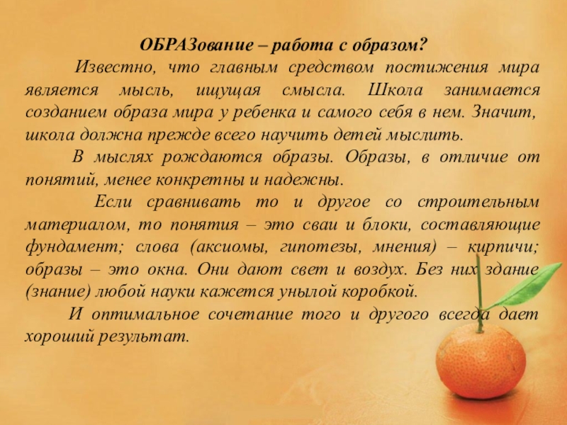 постижения мира является мысль, ищущая смысла. Школа занимается созданием образа мира у ребенка и самого себя в нем. Значит, школа должна прежде всего научить детей мыслить.