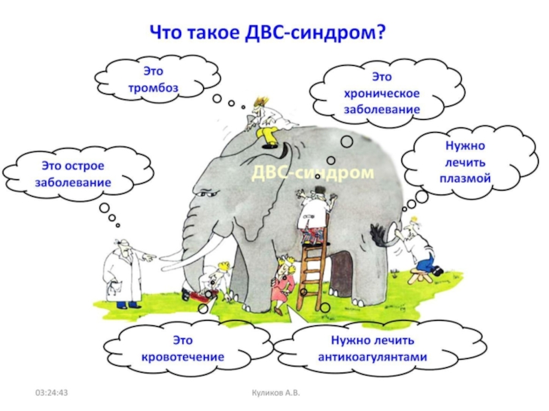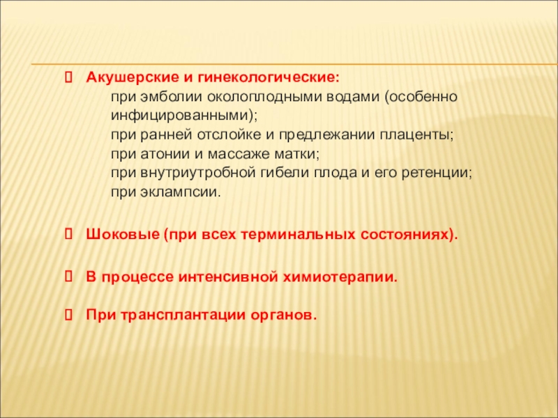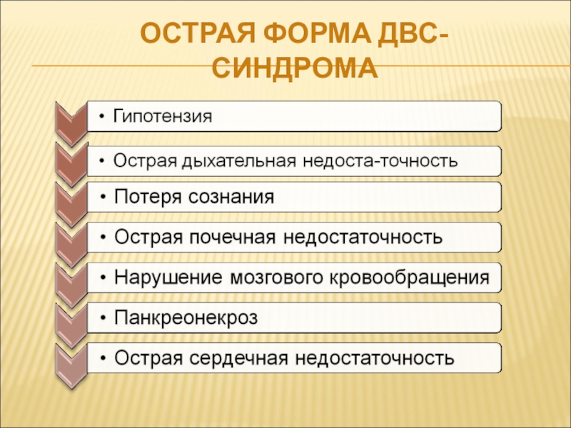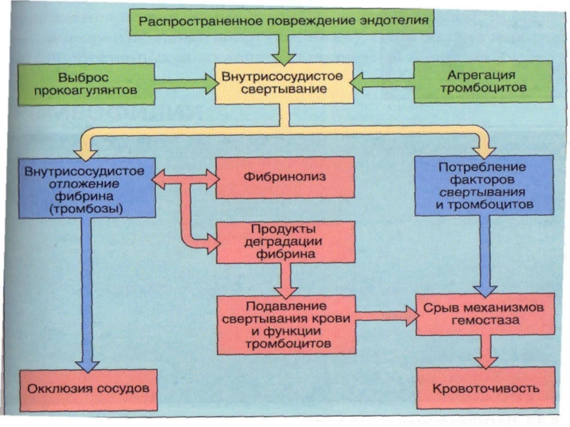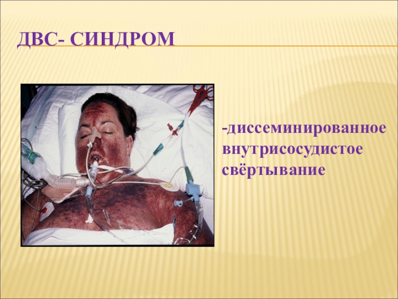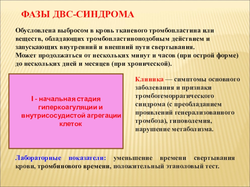 Клиника — симптомы основного заболевания и признаки тромбогеморрагического синдрома (с преобладанием проявлений генерализованного тромбоза), гиповолемия, нарушение метаболизма.