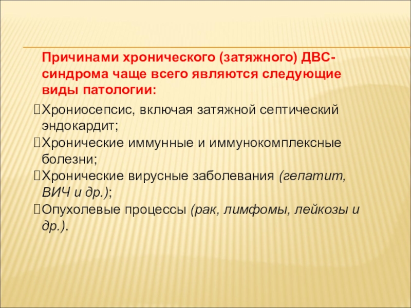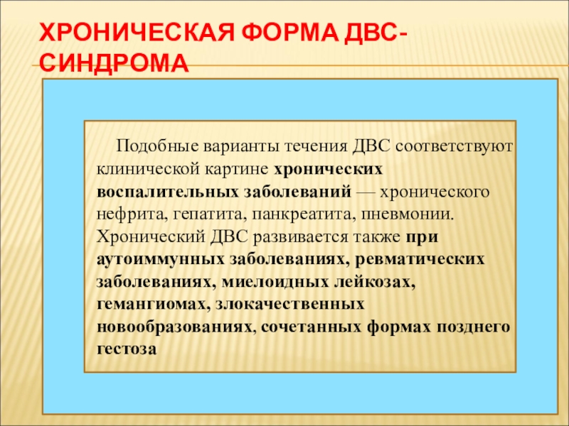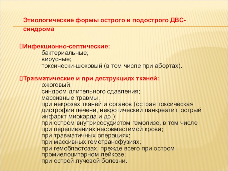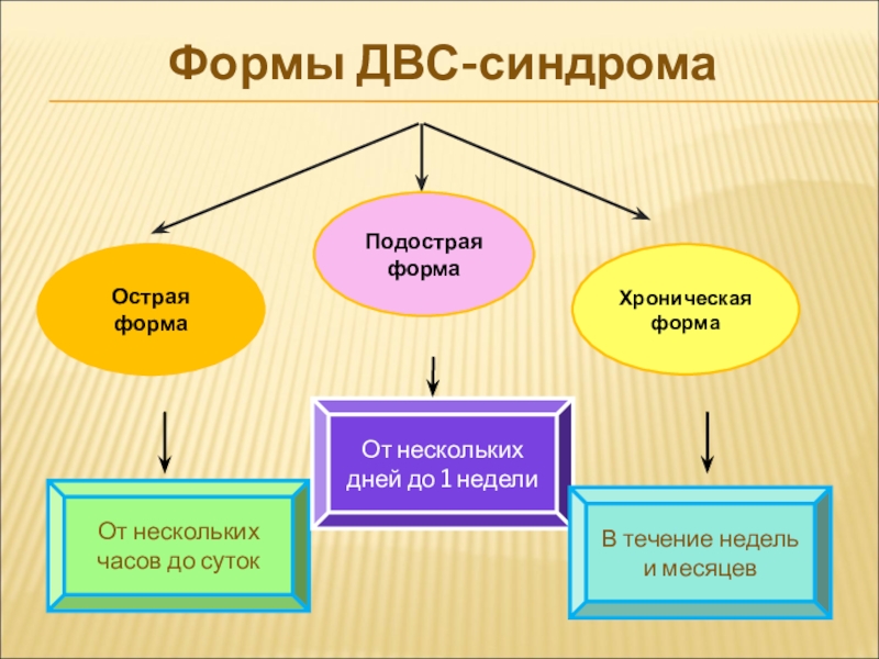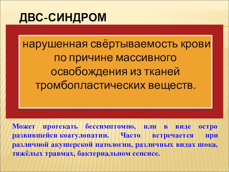 Может протекать бессимптомно, или в виде остро развившейся коагулопатии. Часто встречается при различной акушерской патологии, различных видах шока, тяжёлых травмах, бактериальном сепсисе.