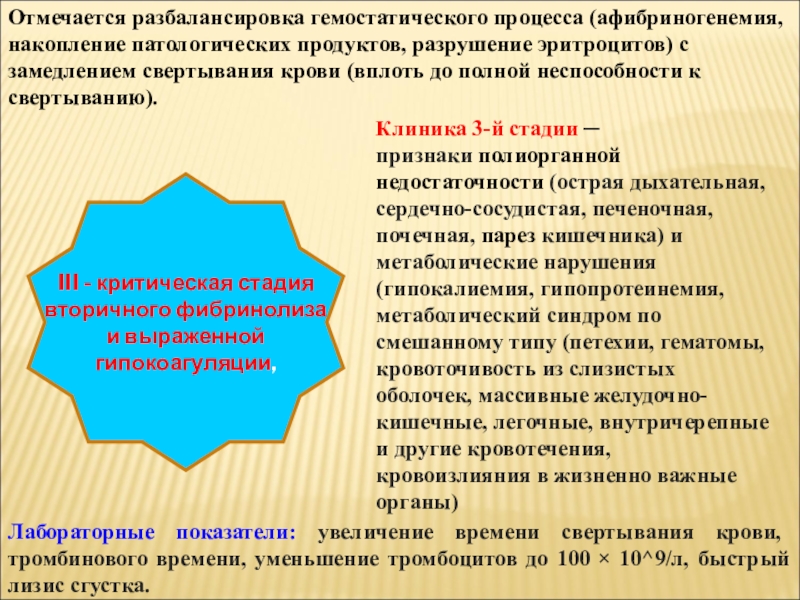 Лабораторные показатели: увеличение времени свертывания крови, тромбинового времени, уменьшение тромбоцитов до 100 × 10^9/л, быстрый лизис сгустка.