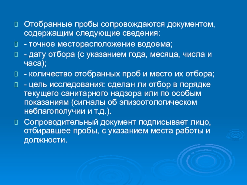 Слайд 13Отобранные пробы сопровождаются документом, содержащим следующие сведения: