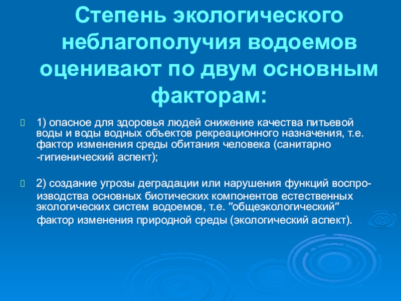 Слайд 4Степень экологического неблагополучия водоемов оценивают по двум основным факторам: