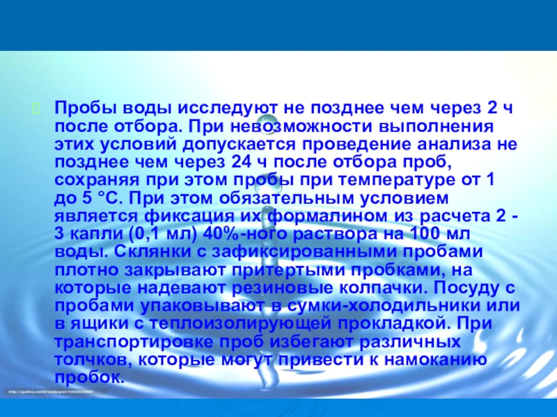 Слайд 12Пробы воды исследуют не позднее чем через 2 ч после отбора.