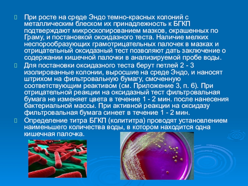 принадлежность к БГКП подтверждают микроскопированием мазков, окрашенных по Граму, и постановкой оксидазного теста. Наличие мелких неспорообразующих грамотрицательных палочек в мазках и отрицательный оксидазный тест позволяют дать заключение о содержании кишечной палочки в анализируемой пробе воды.