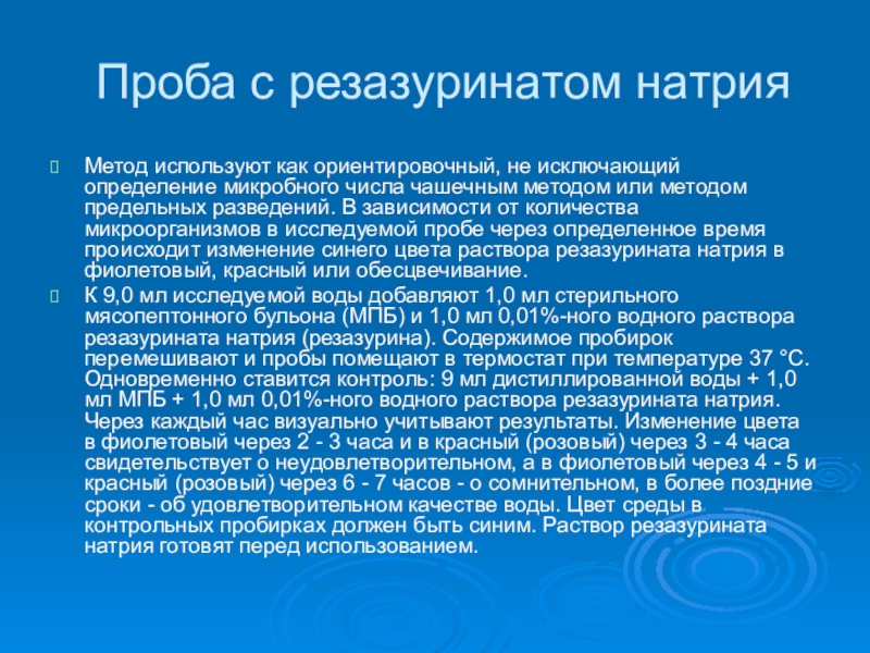 К 9,0 мл исследуемой воды добавляют 1,0 мл стерильного мясопептонного бульона (МПБ) и 1,0 мл 0,01%-ного водного раствора резазурината натрия (резазурина). Содержимое пробирок перемешивают и пробы помещают в термостат при температуре 37 °С. Одновременно ставится контроль: 9 мл дистиллированной воды + 1,0 мл МПБ + 1,0 мл 0,01%-ного водного раствора резазурината натрия. Через каждый час визуально учитывают результаты. Изменение цвета в фиолетовый через 2 - 3 часа и в красный (розовый) через 3 - 4 часа свидетельствует о неудовлетворительном, а в фиолетовый через 4 - 5 и красный (розовый) через 6 - 7 часов - о сомнительном, в более поздние сроки - об удовлетворительном качестве воды. Цвет среды в контрольных пробирках должен быть синим. Раствор резазурината натрия готовят перед использованием.