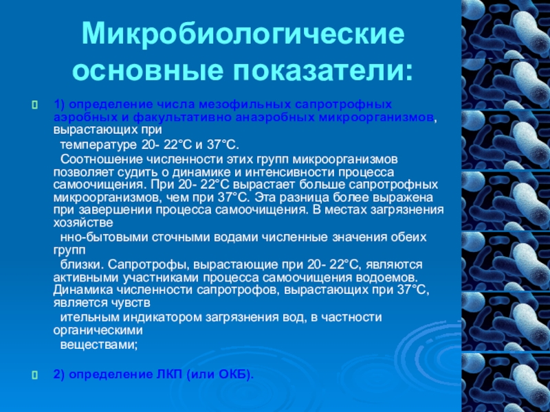 Слайд 6Микробиологические основные показатели: