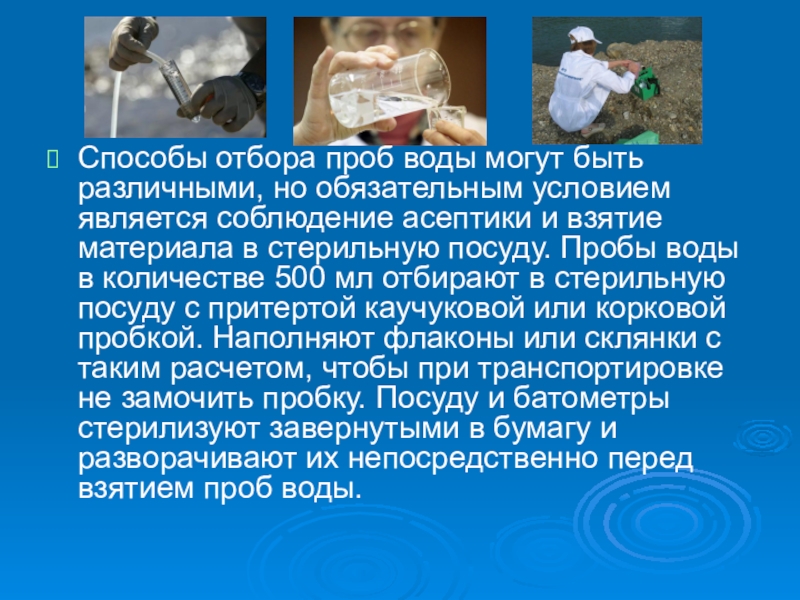 соблюдение асептики и взятие материала в стерильную посуду. Пробы воды в количестве 500 мл отбирают в стерильную посуду с притертой каучуковой или корковой пробкой. Наполняют флаконы или склянки с таким расчетом, чтобы при транспортировке не замочить пробку. Посуду и батометры стерилизуют завернутыми в бумагу и разворачивают их непосредственно перед взятием проб воды.
