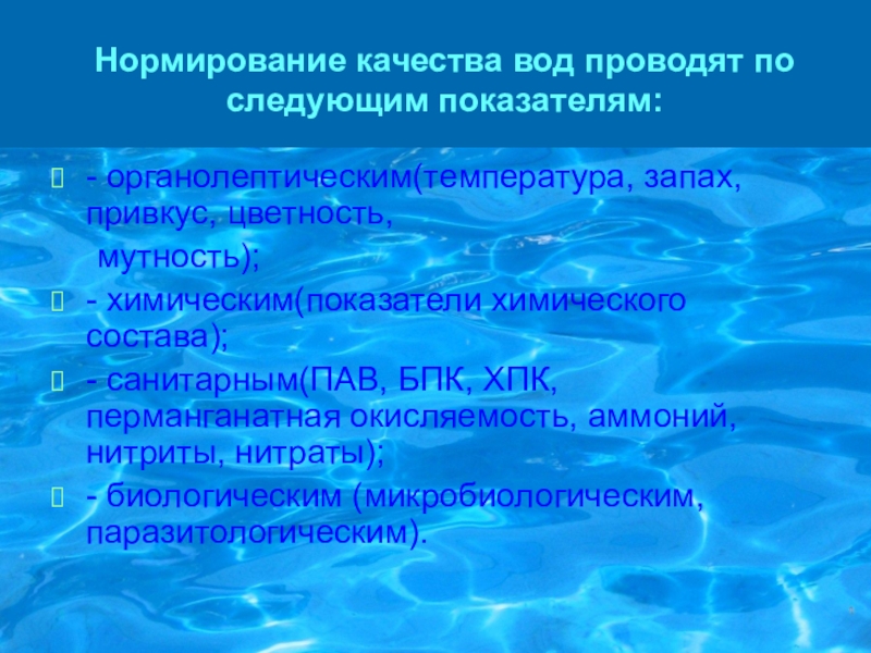 Слайд 5Нормирование качества вод проводят по следующим показателям: