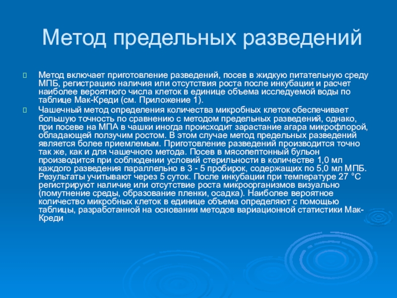 Чашечный метод определения количества микробных клеток обеспечивает большую точность по сравнению с методом предельных разведений, однако, при посеве на МПА в чашки иногда происходит зарастание агара микрофлорой, обладающей ползучим ростом. В этом случае метод предельных разведений является более приемлемым. Приготовление разведений производится точно так же, как и для чашечного метода. Посев в мясопептонный бульон производится при соблюдении условий стерильности в количестве 1,0 мл каждого разведения параллельно в 3 - 5 пробирок, содержащих по 5,0 мл МПБ. Результаты учитывают через 5 суток. После инкубации при температуре 27 °С регистрируют наличие или отсутствие роста микроорганизмов визуально (помутнение среды, образование пленки, осадка). Наиболее вероятное количество микробных клеток в единице объема определяют с помощью таблицы, разработанной на основании методов вариационной статистики Мак-Креди