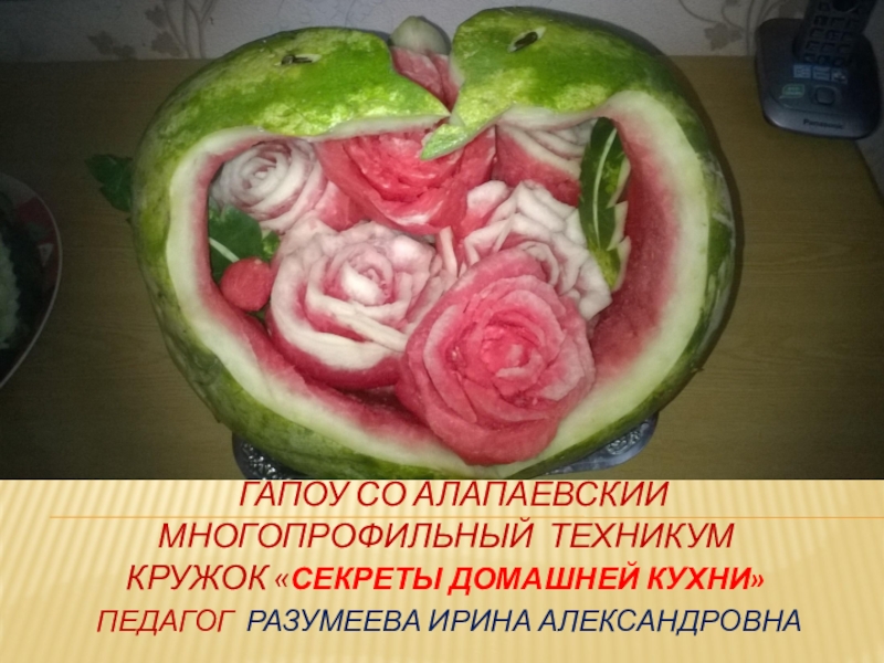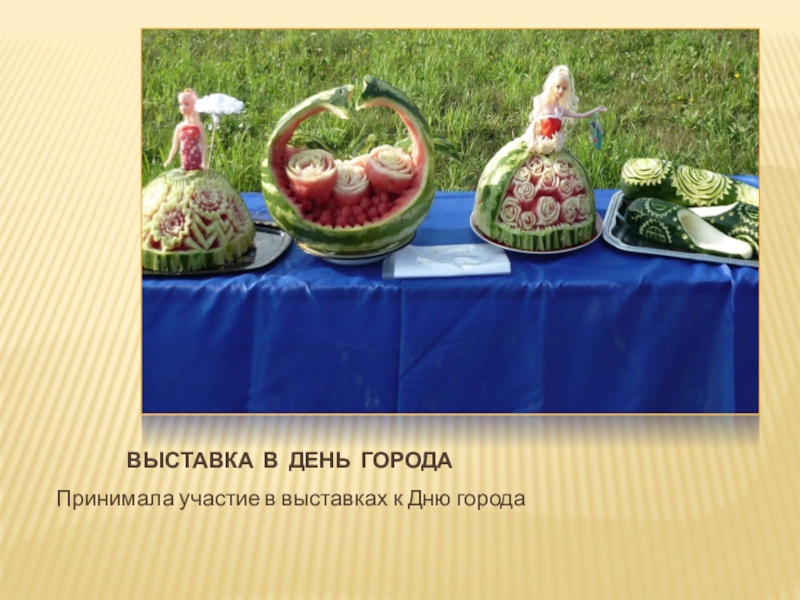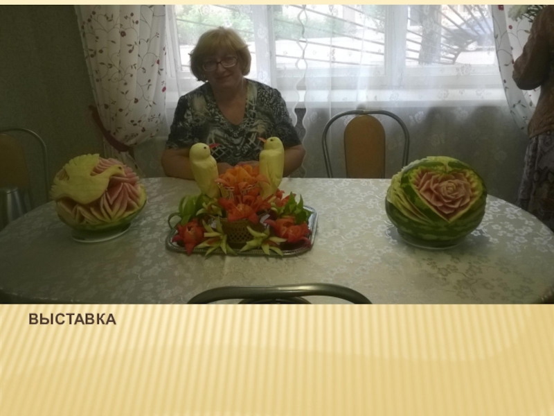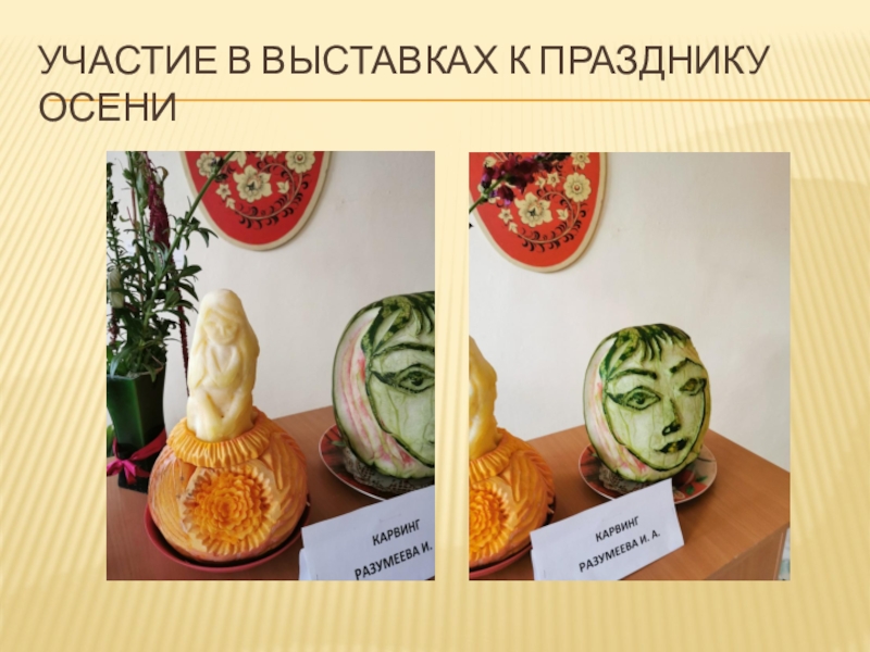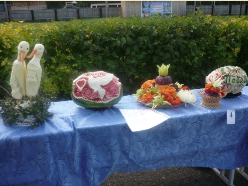 Вырезание из арбуза, дыни, тыквы, составление творческих композиций (пагода – арбуз, цветок плюща – арбуз, тыква с рыбой, георгины - арбуз, дыня, тыква, кот из декорации -арбуз, дыня, тыква) и т.д.