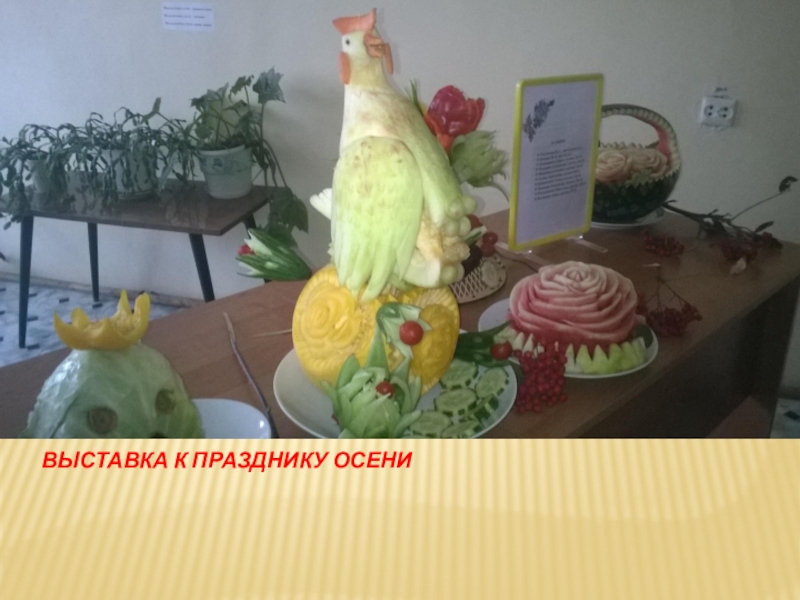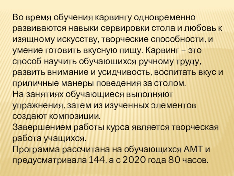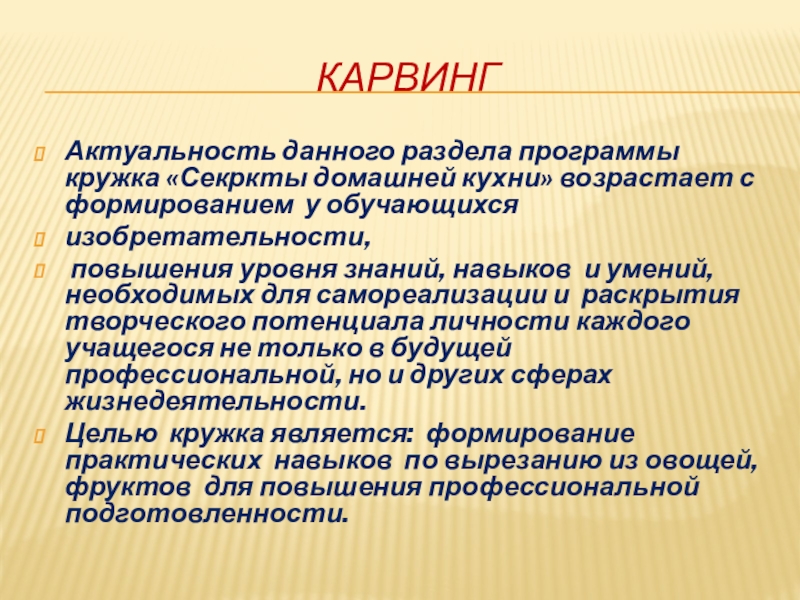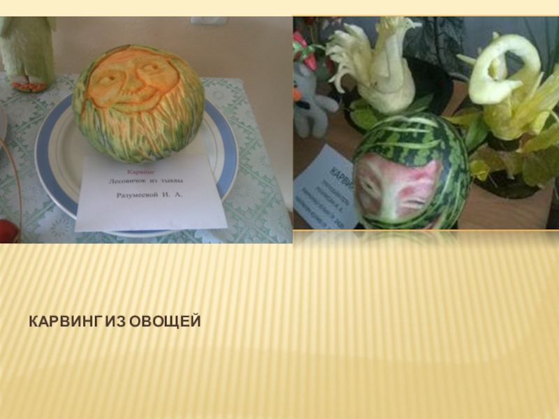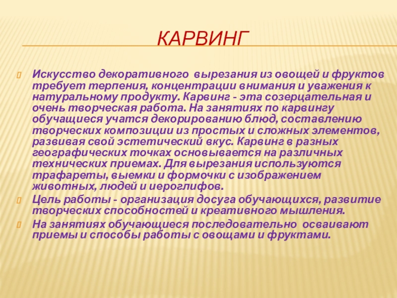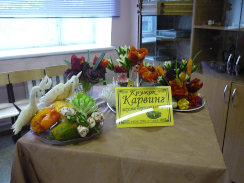 к изящному искусству, творческие способности, и умение готовить вкусную пищу. Карвинг – это способ научить обучающихся ручному труду, развить внимание и усидчивость, воспитать вкус и приличные манеры поведения за столом.