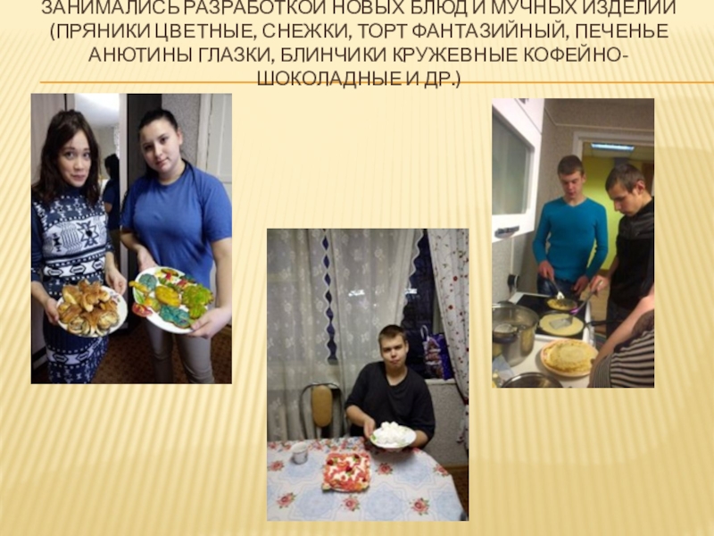 Слайд 16Занимались разработкой новых блюд и мучных изделий (пряники цветные, снежки, торт
