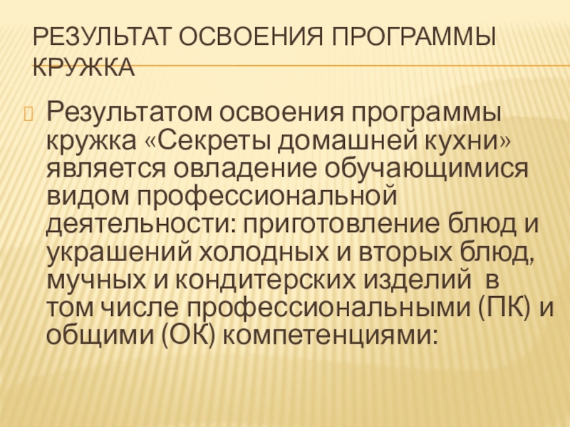 Результатом освоения программы кружка «Секреты домашней кухни» является