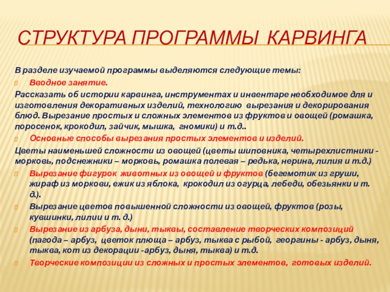 истории карвинга, инструментах и инвентаре необходимое для и изготовления декоративных изделий, технологию вырезания и декорирования блюд. Вырезание простых и сложных элементов из фруктов и овощей (ромашка, поросенок, крокодил, зайчик, мышка, гномики) и т.д..