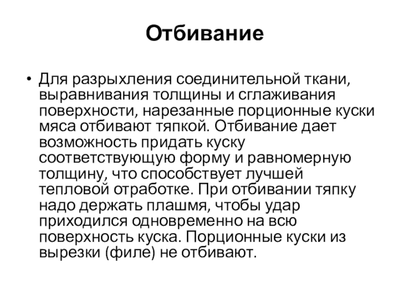 куски мяса отбивают тяпкой. Отбивание дает возможность придать куску соответствующую форму и равномерную толщину, что способствует лучшей тепловой отработке. При отбивании тяпку надо держать плашмя, чтобы удар приходился одновременно на всю поверхность куска. Порционные куски из вырезки (филе) не отбивают.