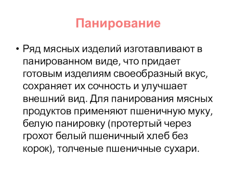 своеобразный вкус, сохраняет их сочность и улучшает внешний вид. Для панирования мясных продуктов применяют пшеничную муку, белую панировку (протертый через грохот белый пшеничный хлеб без корок), толченые пшеничные сухари.