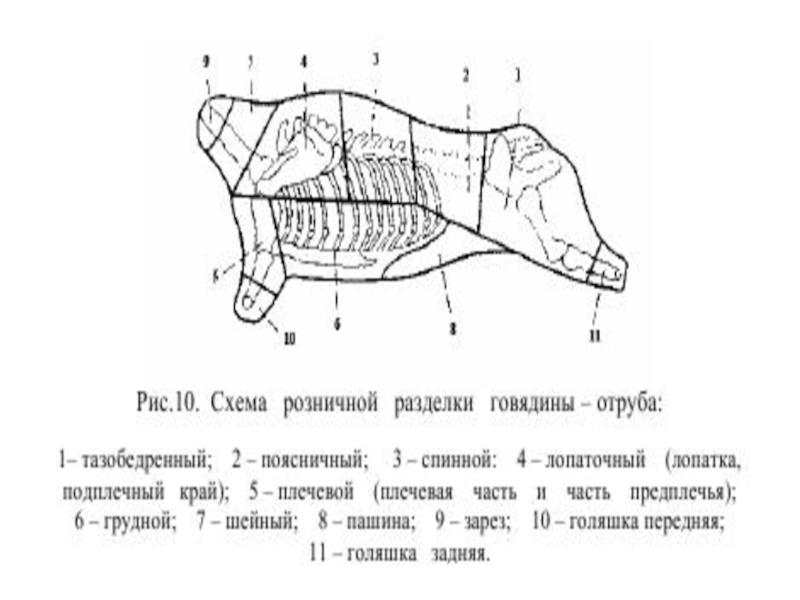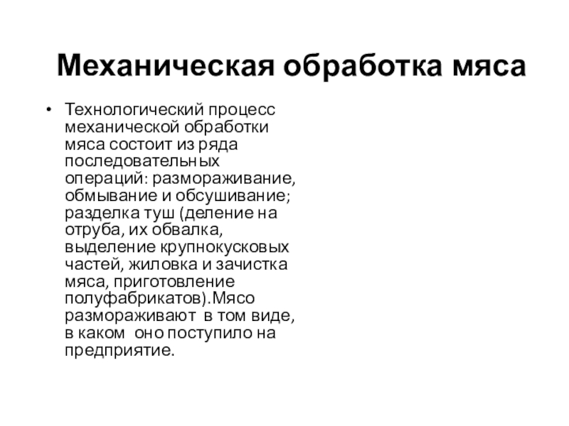 операций: размораживание, обмывание и обсушивание; разделка туш (деление на отруба, их обвалка, выделение крупнокусковых частей, жиловка и зачистка мяса, приготовление полуфабрикатов).Мясо размораживают в том виде, в каком оно поступило на предприятие.