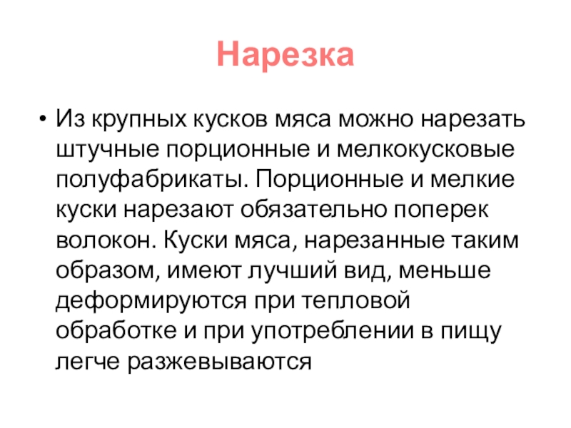 Порционные и мелкие куски нарезают обязательно поперек волокон. Куски мяса, нарезанные таким образом, имеют лучший вид, меньше деформируются при тепловой обработке и при употреблении в пищу легче разжевываются