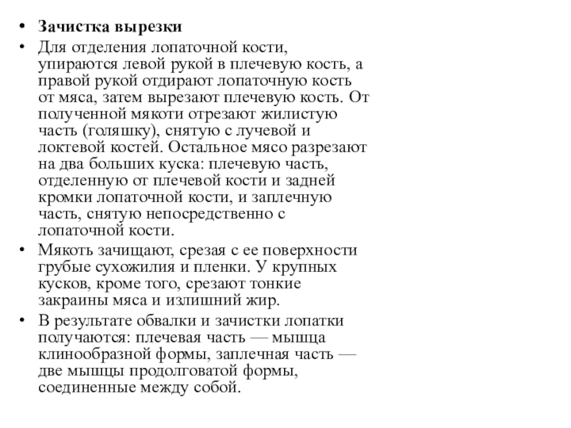 а правой рукой отдирают лопаточную кость от мяса, затем вырезают плечевую кость. От полученной мякоти отрезают жилистую часть (голяшку), снятую с лучевой и локтевой костей. Остальное мясо разрезают на два больших куска: плечевую часть, отделенную от плечевой кости и задней кромки лопаточной кости, и заплечную часть, снятую непосредственно с лопаточной кости.