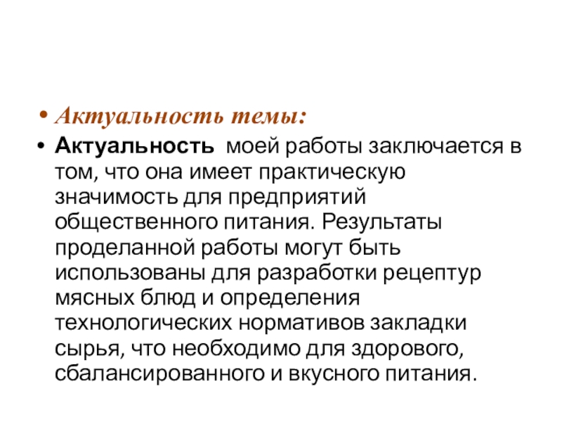 значимость для предприятий общественного питания. Результаты проделанной работы могут быть использованы для разработки рецептур мясных блюд и определения технологических нормативов закладки сырья, что необходимо для здорового, сбалансированного и вкусного питания.