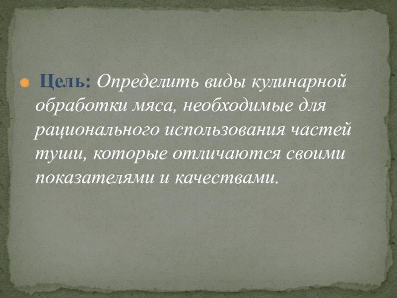 Слайд 2 Цель: Определить виды кулинарной обработки мяса, необходимые для рационального использования