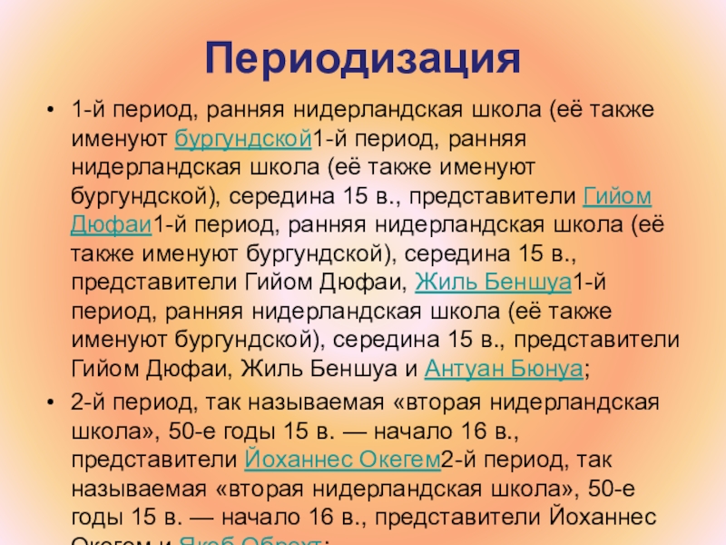нидерландская школа (её также именуют бургундской), середина 15 в., представители Гийом Дюфаи1-й период, ранняя нидерландская школа (её также именуют бургундской), середина 15 в., представители Гийом Дюфаи, Жиль Беншуа1-й период, ранняя нидерландская школа (её также именуют бургундской), середина 15 в., представители Гийом Дюфаи, Жиль Беншуа и Антуан Бюнуа;