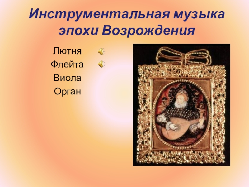 Слайд 19Инструментальная музыка эпохи Возрождения