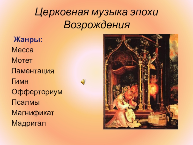 Слайд 20Церковная музыка эпохи Возрождения