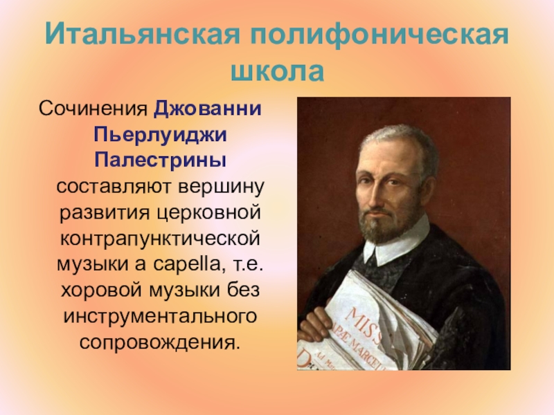 Сочинения Джованни Пьерлуиджи Палестрины составляют вершину развития церковной контрапунктической