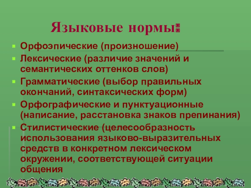 Стилистические (целесообразность использования языково-выразительных средств в конкретном лексическом окружении, соответствующей ситуации общения