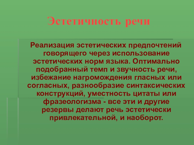 языка. Оптимально подобранный темп и звучность речи, избежание нагромождения гласных или согласных, разнообразие синтаксических конструкций, уместность цитаты или фразеологизма - все эти и другие резервы делают речь эстетически привлекательной, и наоборот.