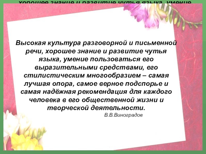 Высокая культура разговорной и письменной речи, хорошее знание и развитие чутья языка, умение пользоваться его выразительными средствами, его стилистическим многообразием – самая лучшая опора, самое верное подспорье и самая надёжная рекомендация для каждого человека в его общественной жизни и творческой деятельности.
