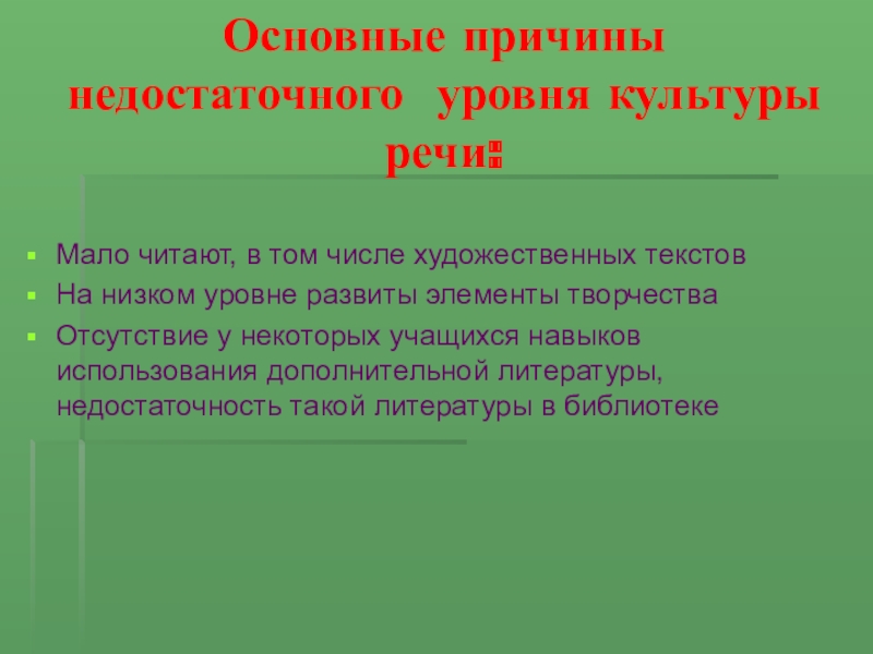 Слайд 27Основные причины недостаточного уровня культуры речи: