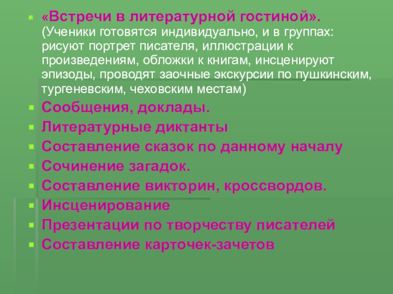 портрет писателя, иллюстрации к произведениям, обложки к книгам, инсценируют эпизоды, проводят заочные экскурсии по пушкинским, тургеневским, чеховским местам)