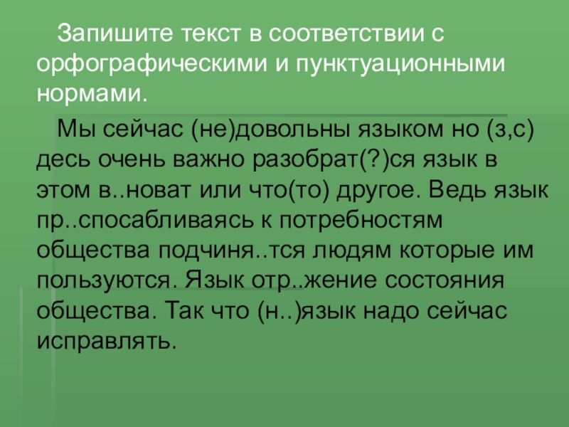 Мы сейчас (не)довольны языком но (з,с)десь очень важно разобрат(?)ся язык в этом в..новат или что(то) другое. Ведь язык пр..спосабливаясь к потребностям общества подчиня..тся людям которые им пользуются. Язык отр..жение состояния общества. Так что (н..)язык надо сейчас исправлять.