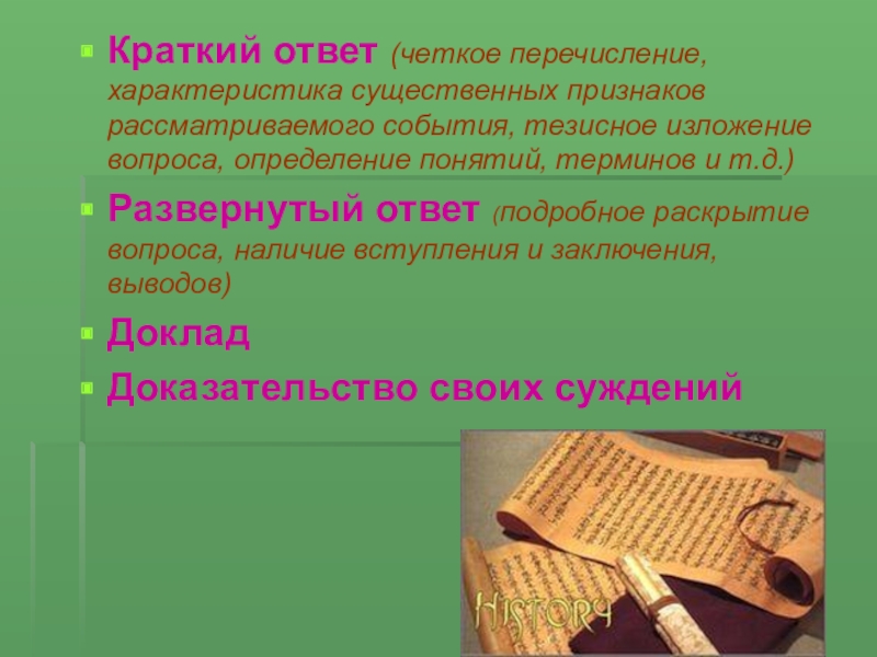 Слайд 22Краткий ответ (четкое перечисление, характеристика существенных признаков рассматриваемого события, тезисное изложение