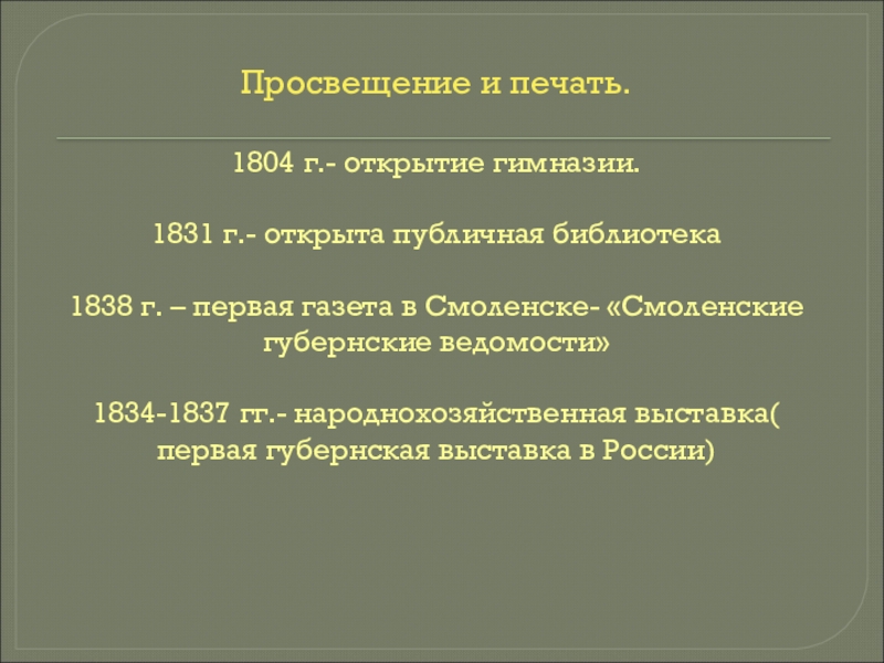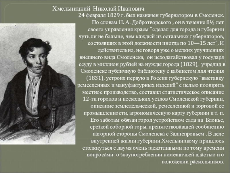 Н. А. Добротворского , он в течение 8½ лет своего управления краем "сделал для города и губернии чуть ли не больше, чем каждый из остальных губернаторов, состоявших в этой должности иногда по 10—15 лет". И действительно, не говоря уже о мелких улучшениях внешнего вида Смоленска, он исходатайствовал у государя ссуду в миллион рублей на нужды города (1829), учредил в Смоленске публичную библиотеку с кабинетом для чтения (1831), устроил первую в России губернскую "выставку ремесленных и мануфактурных изделий" с целью поощрить местное производство, составил статистическое описание 12-ти городов и нескольких уездов Смоленской губернии, описание земледельческой, ремесленной и торговой ее промышленности, агрономическую карту губернии и т. п. Его заботам обязан город устройством сада на Блонье, срезкой соборной горы, препятствовавшей сообщению нагорной стороны Смоленска с Заднепровьем . В деле внутренней жизни губернии Хмельницкому пришлось столкнуться с двумя очень щекотливыми по тому времени вопросами: о злоупотреблении помещичьей властью и о положении раскольников.