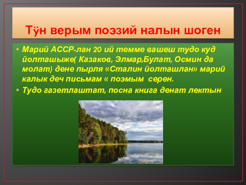 М.КазаковЧулым рвезе тунемашат, возымо пашалан кÿлынак пижеЙолташна сай поэт лиеш манын чот ÿшанышна.Но шучко колымаш 23 ияш