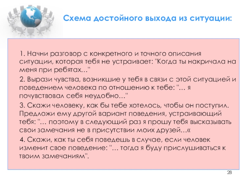 Ведущий предлагает кому-нибудь из участников группы вспомнить и рассказать ситуацию, когда его или кого-нибудь из его знакомых обидели. Этот участник выступит в роли того, кого обидели, а другой в роли обидчика. Участники должны разыграть эту сцену. Используя предложенную ниже схему, "обиженный" попытается достойно выйти из ситуации. Например, мама отчитала сына при друзьях за то, что он не вымыл посуду.