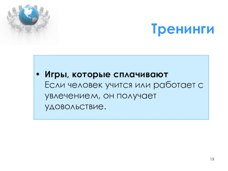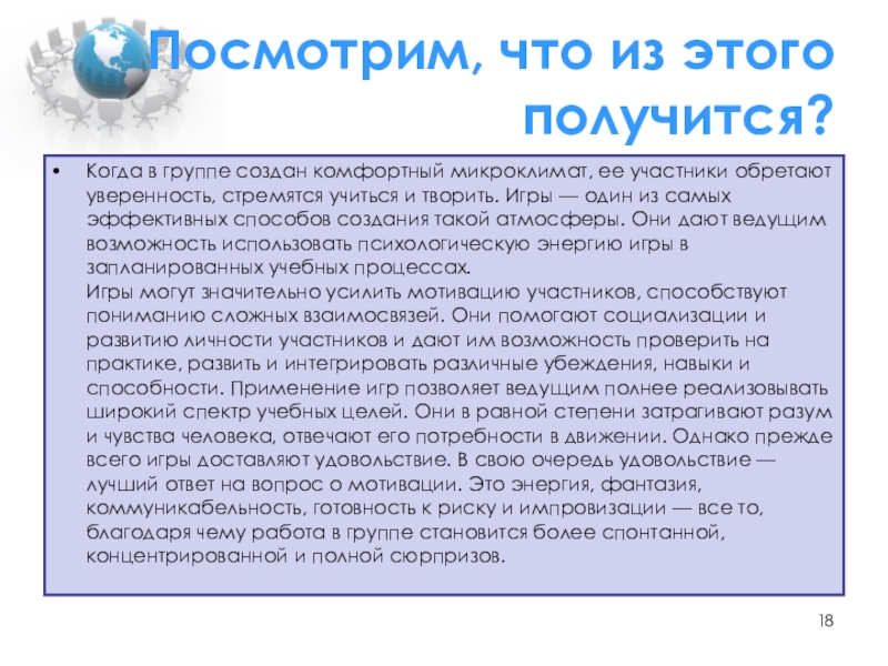участники обретают уверенность, стремятся учиться и творить. Игры — один из самых эффективных способов создания такой атмосферы. Они дают ведущим возможность использовать психологическую энергию игры в запланированных учебных процессах.