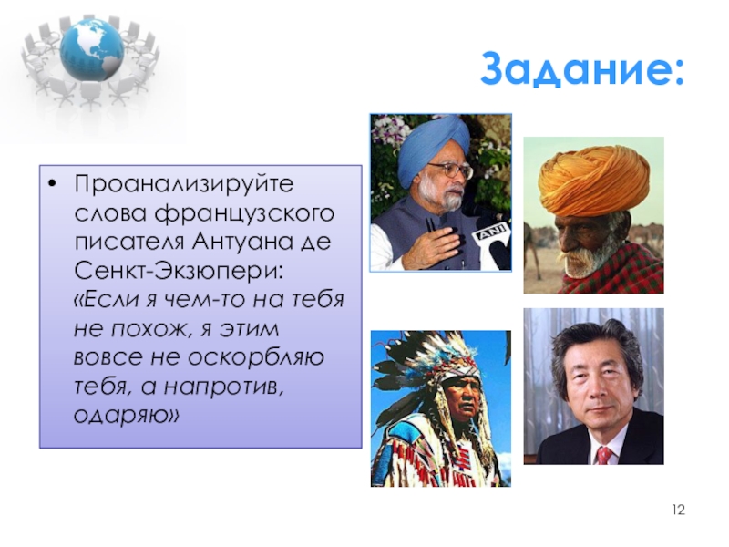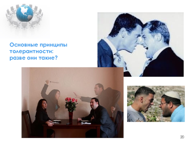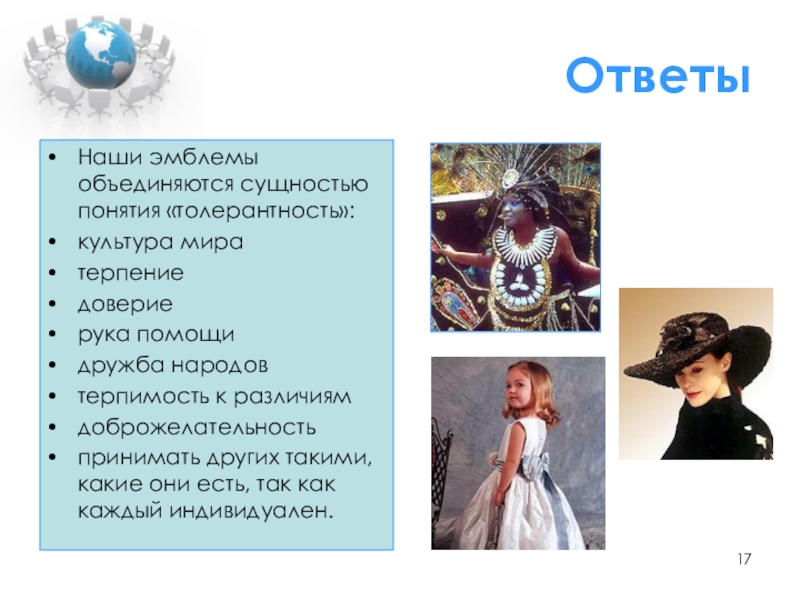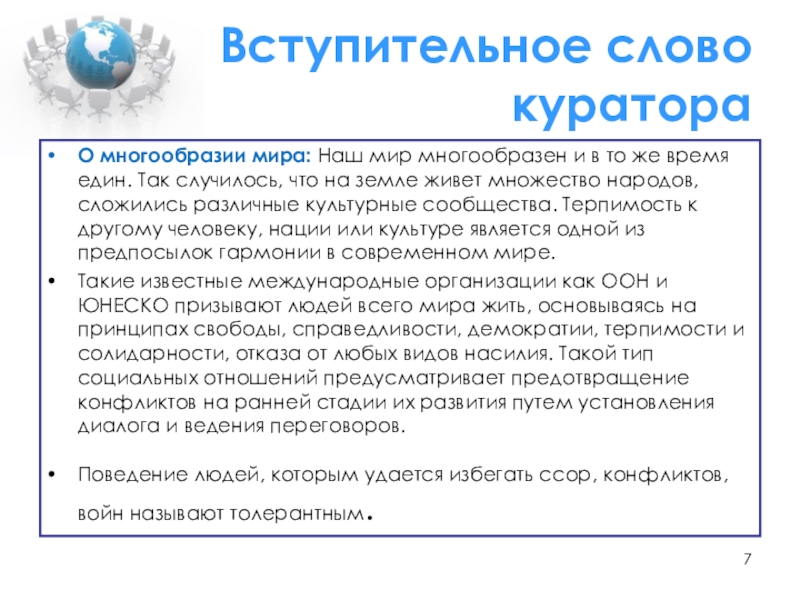 же время един. Так случилось, что на земле живет множество народов, сложились различные культурные сообщества. Терпимость к другому человеку, нации или культуре является одной из предпосылок гармонии в современном мире.