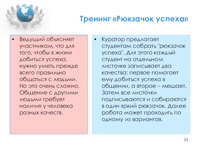 Куратор предлагает студентам собрать "рюкзачок успеха". Для этого каждый студент на отдельном листочке записывает два качества: первое помогает ему добиться успеха в общении, а второе – мешает. Затем все листочки подписываются и собираются в один яркий рюкзачок. Далее работа может проходить по одному из вариантов.
