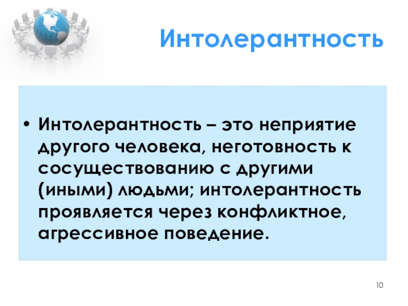(иными) людьми; интолерантность проявляется через конфликтное, агрессивное поведение.