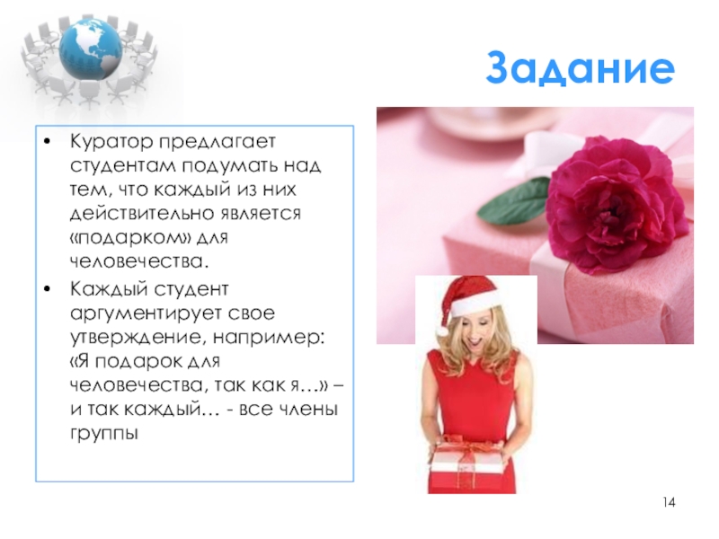 Каждый студент аргументирует свое утверждение, например: «Я подарок для человечества, так как я…» – и так каждый… - все члены группы