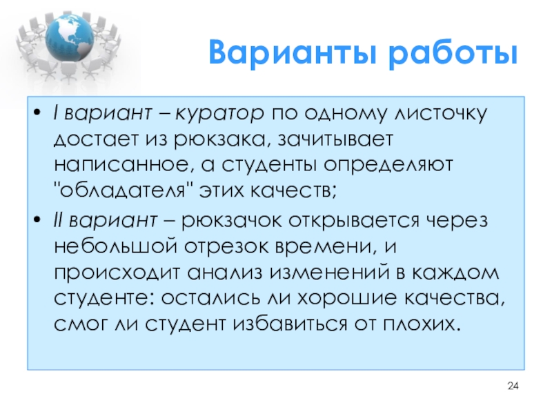 II вариант – рюкзачок открывается через небольшой отрезок времени, и происходит анализ изменений в каждом студенте: остались ли хорошие качества, смог ли студент избавиться от плохих.
