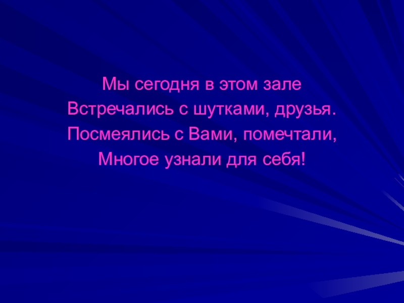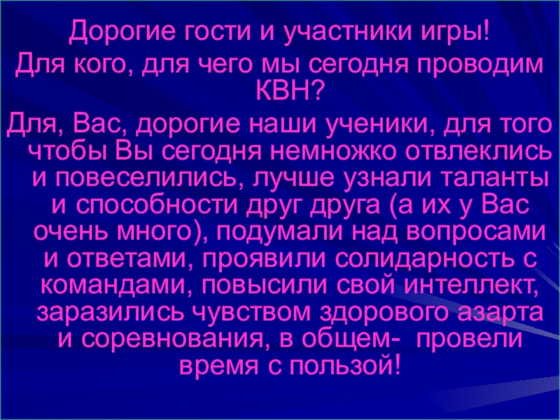 Для, Вас, дорогие наши ученики, для того чтобы Вы сегодня немножко отвлеклись и повеселились, лучше узнали таланты и способности друг друга (а их у Вас очень много), подумали над вопросами и ответами, проявили солидарность с командами, повысили свой интеллект, заразились чувством здорового азарта и соревнования, в общем- провели время с пользой!