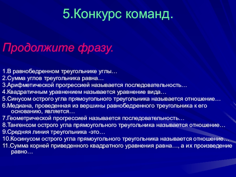 5.Синусом острого угла прямоугольного треугольника называется отношение…