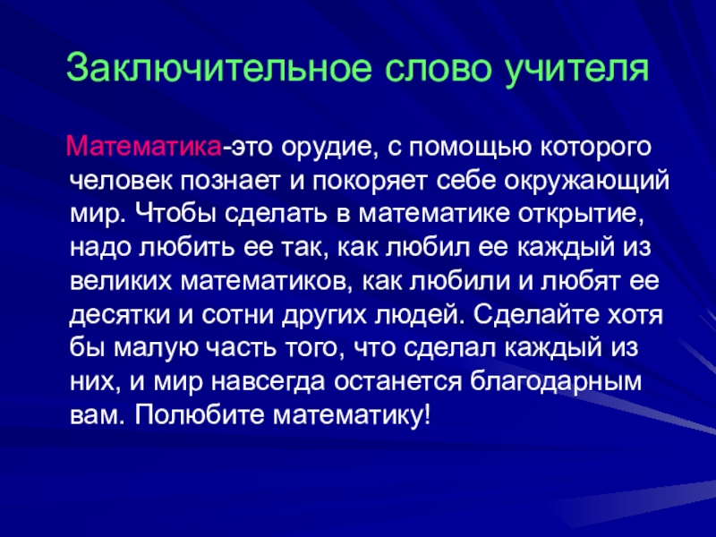 и покоряет себе окружающий мир. Чтобы сделать в математике открытие, надо любить ее так, как любил ее каждый из великих математиков, как любили и любят ее десятки и сотни других людей. Сделайте хотя бы малую часть того, что сделал каждый из них, и мир навсегда останется благодарным вам. Полюбите математику!