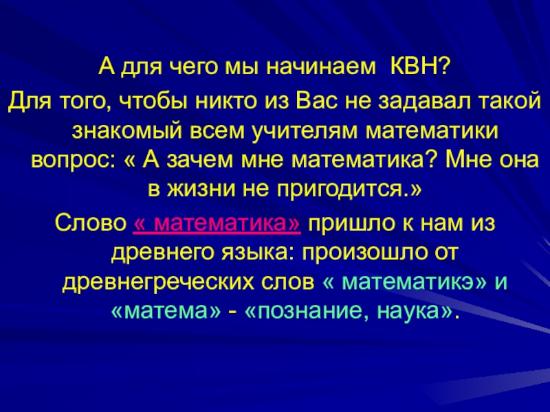 Слово « математика» пришло к нам из древнего языка: произошло от древнегреческих слов « математикэ» и «матема» - «познание, наука».